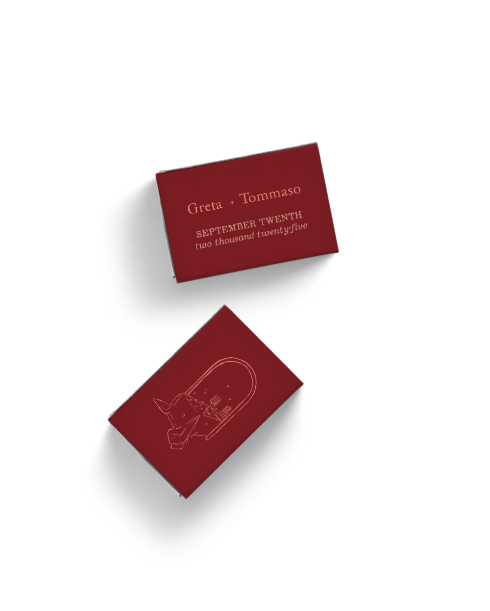 The set includes: Save the Date, invitation, matchboxes, place cards, and menu.